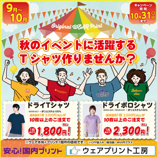 安心の自社管理・国内縫製で高品質・短納期も実現。また、フルカラーでオリジナルプリントにこだわれるのに格安で、1枚から気軽に作成が可能。さらに枚数が増えるほど、1枚あたりの価格がお得になります。個人様・同人サークルでの作成、法人様や官公庁様・各種団体様からの大量発注にも対応いたします。