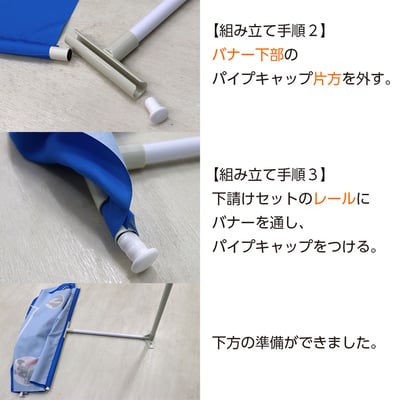 【組み立て手順3】下請けセットのレールにバナーを通し、パイプキャップをつける。