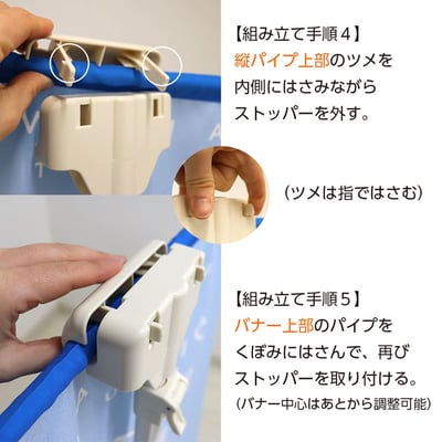 【組み立て手順5】バナー上部のパイプをくぼみにはさんで、再びストッパーを取り付ける。