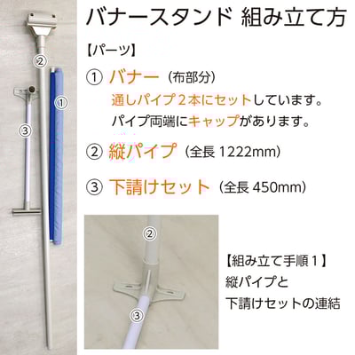 【パーツ】 ①バナー(通しパイプ2本にセット)、②縦パイプ(全長1220mm)、③下請けセット(全長450mm)