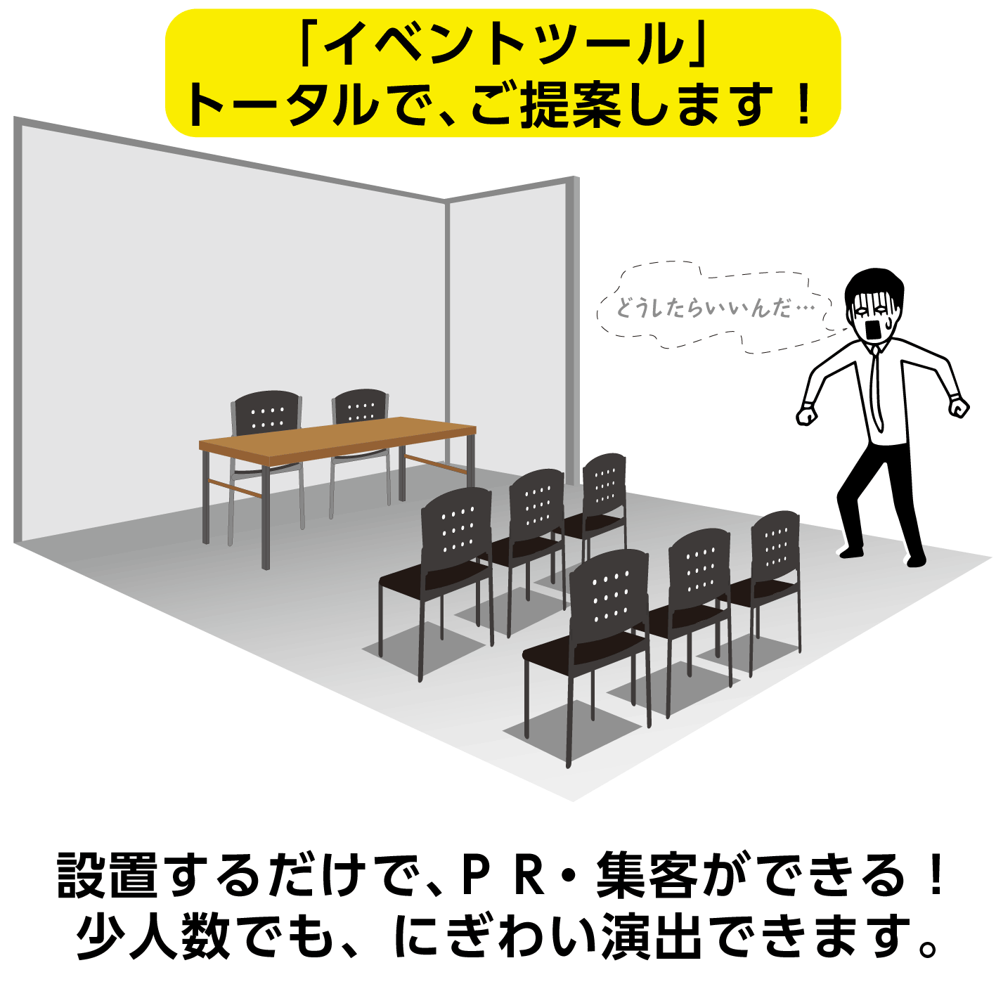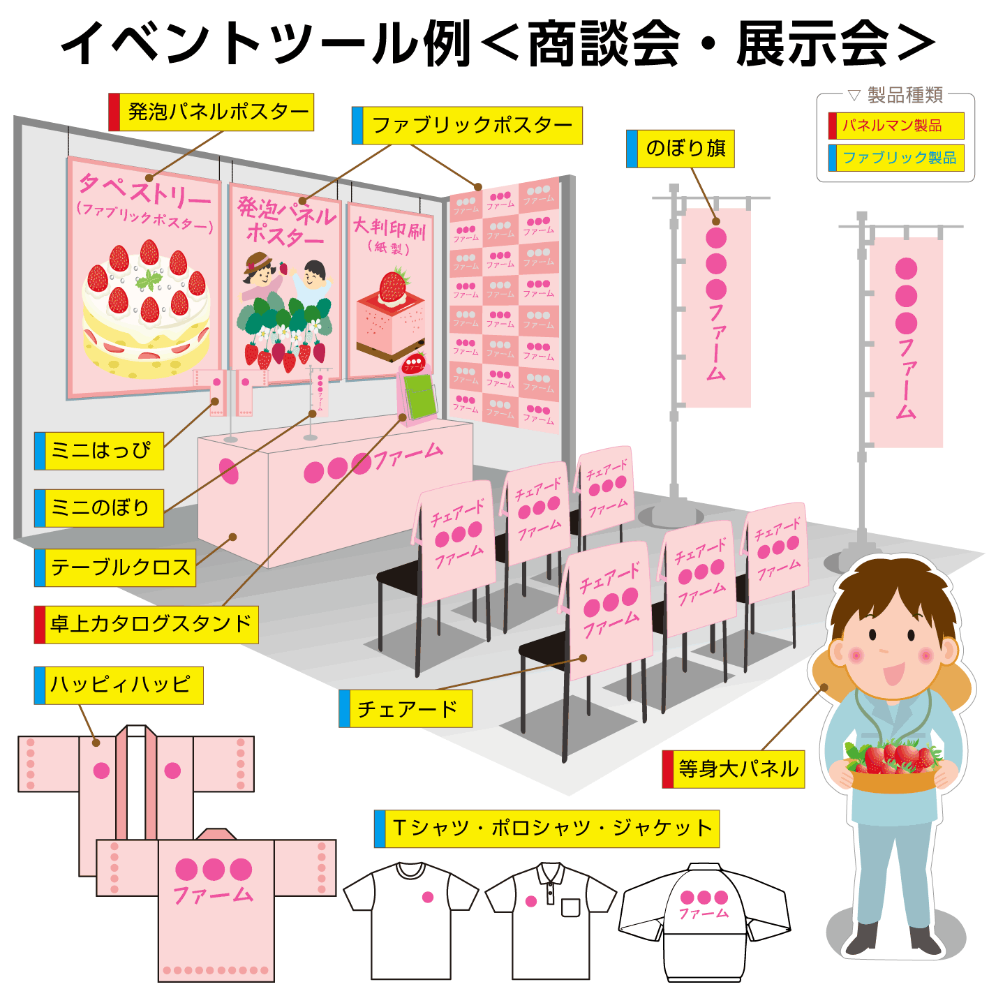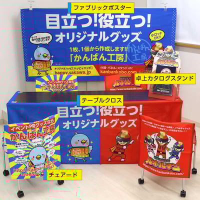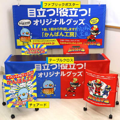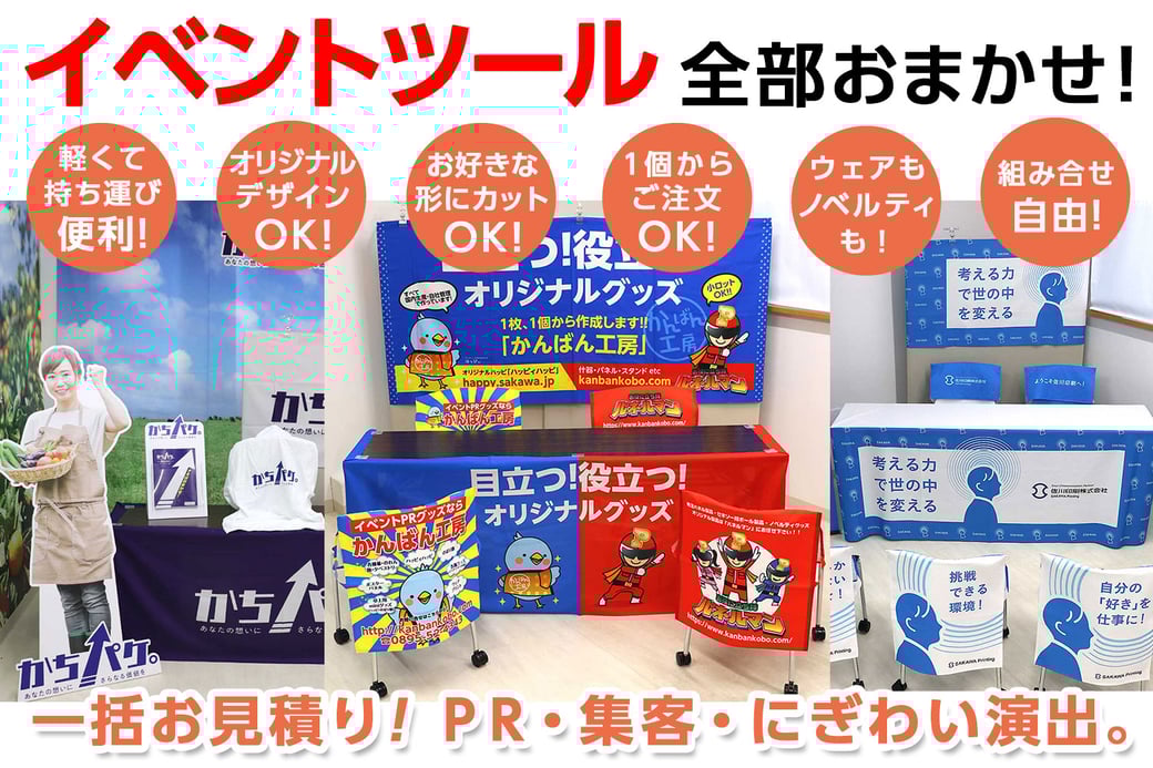 かんばん工房では、各種イベントツールが製作でき、それらをトータルでご提案できます。全体のデザインを統一し、魅力的なイベントツールをオリジナルで製作いたします。ぜひお任せください。