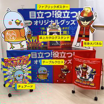 「発泡パネルポスター」は、背面スタンドを付けることができ、自立させたり、吊るすこともできます。卓上に「キャラクター卓上POP」を使い、PRしたい内容を載せることができます。