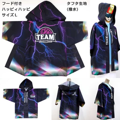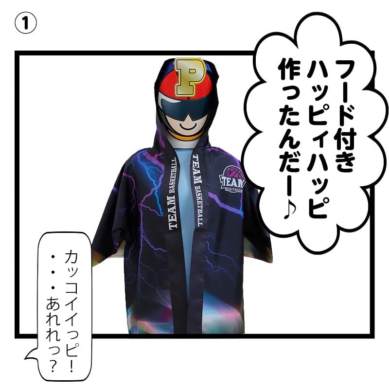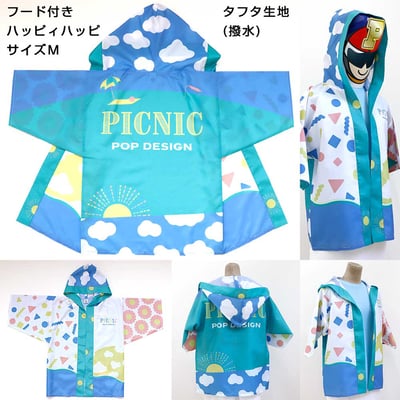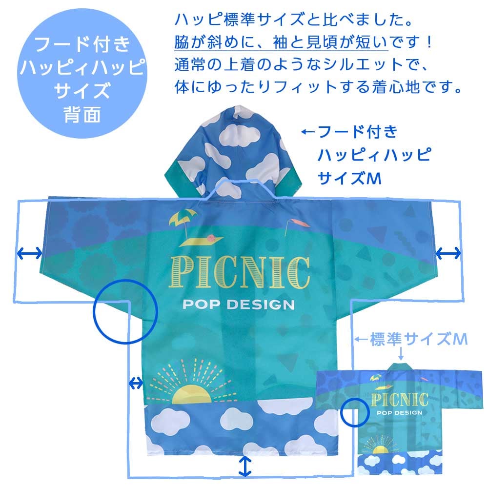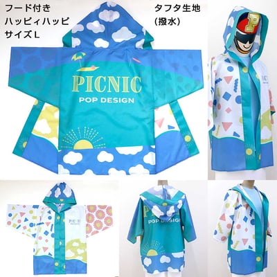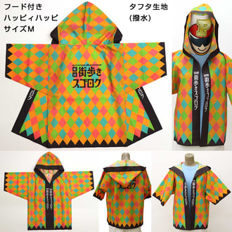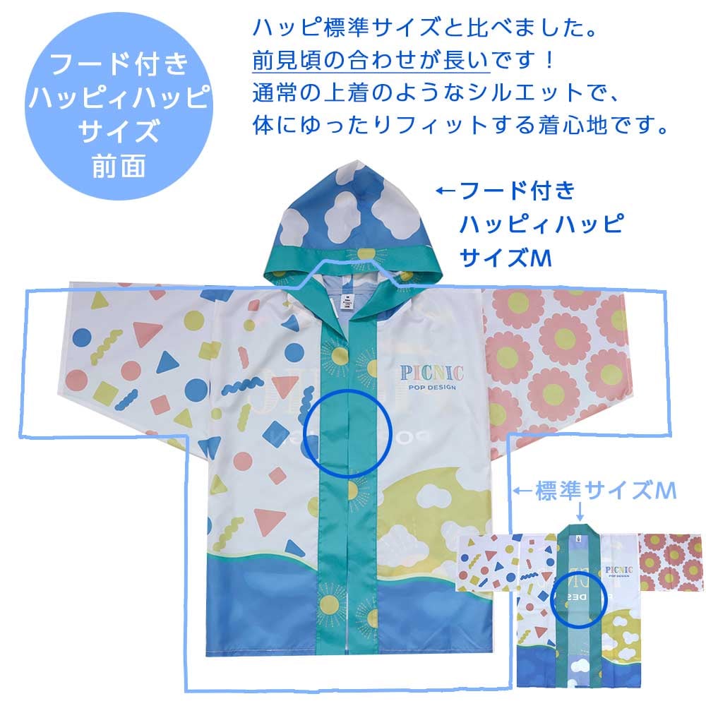 ハッピに「フード」が付いて、オシャレに着こなし!「撥水生地」なので、雨でも安心です。