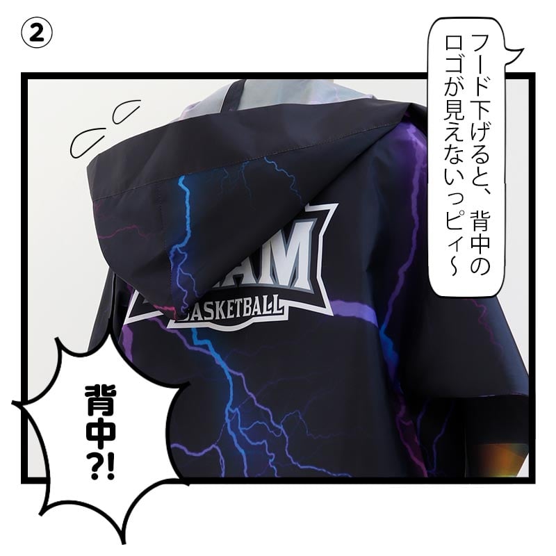 フードでロゴが見えないのは残念。フードで隠れない位置に配置しましょう。