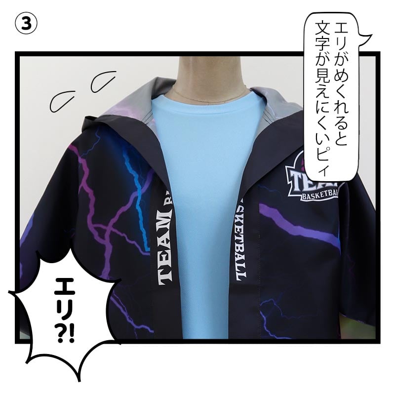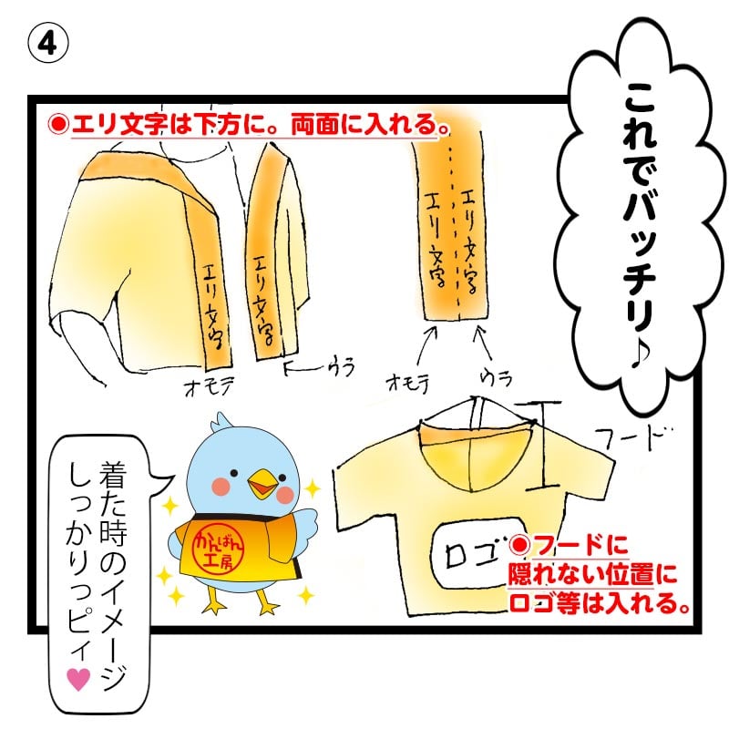 フードによって、エリがめくれやすいです。そのため、ロゴを中央より下方に、両面に入れることをおすすめ。めくれても、裏側になっても見えやすくなります。