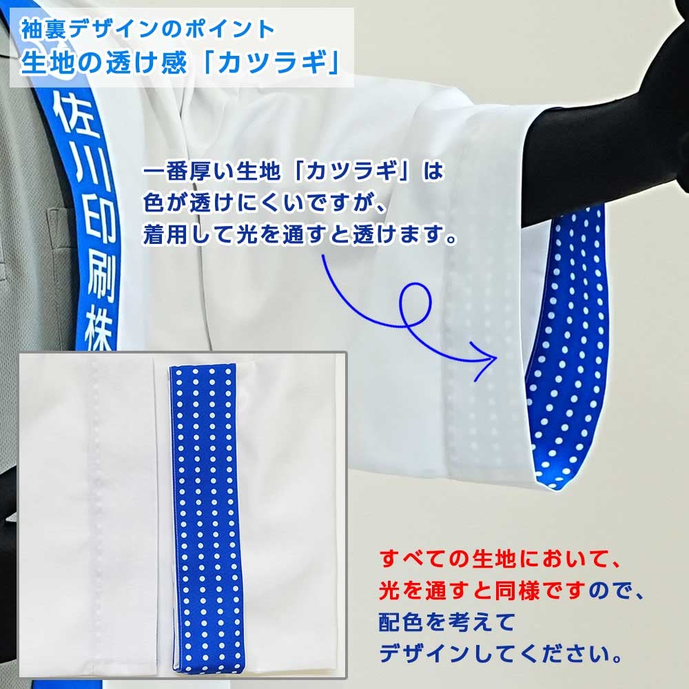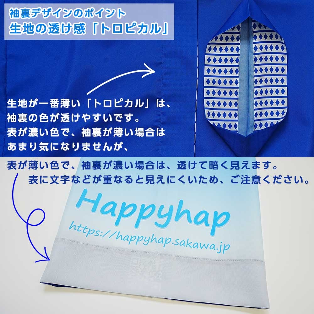 生地が一番薄い「トロピカル」は、袖裏の色が透けやすいです。表が濃い色で、袖裏が薄い場合はあまり気になりませんが、表が薄い色で、袖裏が濃い場合は、透けて暗く見えます。表に文字などが重なると見えにくいため、ご注意ください。