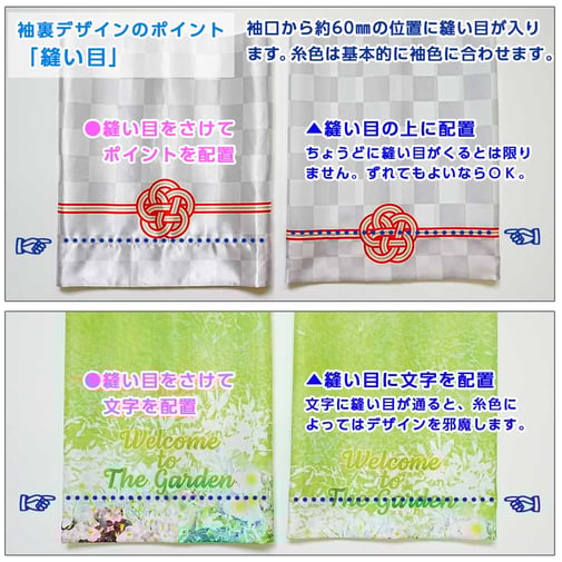 袖裏のデザインは、袖の反対色、同色系の濃淡、柄続きにするなどがあります。折り返した時にどう見せたいかも考えておきましょう。
